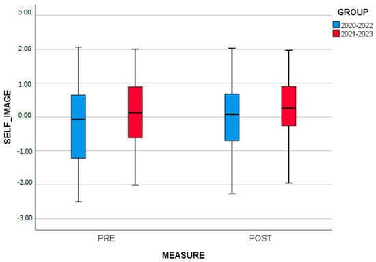 Similarly, two-way repeated measures ANOVA was applied to examine whether there are differences in SELF_IMAGE between the measures (initial, final) and the GROUPS (2020–2022, 2021–2023). The results show that there is no statistically significant interaction between the measures and the GROUPS (p = 0.807). However, a significant main effect of the factor GROUPS (p = 0.036) was found, as well as statistically significant differences in the SELF_IMAGE between the initial and final measurement (p < 0.001). Examining the means, it appears that participants had a higher SELF_IMAGE score at the final measurement (M = 0.72 ± 0.95) than at the initial measurement (M = −0.72 ± 1.04) (Figure 4).