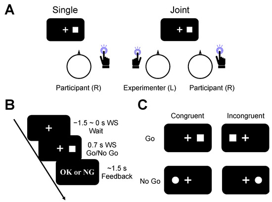 Methodologies for the joint go and no-go task. (A) Experimental conditions. Participants sat on the right and were directed to the liquid crystal display without (single) and with an experimenter sitting on the left (joint). The participant and experimenter were asked to fix the cross at the center of the screen. (B) The task sequences consisted of three phases: wait (−1.5–0 s from the warning signal (WS)), go/no-go (0.7 s after WS), and feedback (1.5 s after WS). (C) Reaction cues were divided into two categories: go (white square) and no-go (white circle). Additionally, these cues were subdivided depending on the stimulus location of the fixation cross: right (congruent) or left (incongruent).
