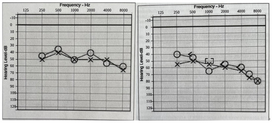 Audiograms (Left: at 16 years old. Right: at 18 years old). Bilateral moderate-to-profound progressive hearing loss. The sign “O” stands for right ear unmasked air conduction. The symbol “X” stands for left ear unmasked air conduction. The symbol “[” stands for right ear masked bone conduction. The sign “]” stands for right ear masked bone conduction.