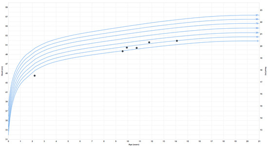 Growth problems: She experienced early failure to thrive, which resolved during late childhood when she began to have relative overweight with truncal obesity. Her height started to plateau around age 13–14, and her final adult height is around the 50th percentile. At age 9, the weight progressively increased from the 4th percentile to the 80th percentile and has plateaued since age 16. Her BMI also increased around ten years old from the 7th percentile to the 85th percentile (at 20 years). The earliest head circumference measurement available was at 8 months, in the second percentile, and the last measurement at age 18 was 52.5 cm (fourth percentile) (Figure 3).