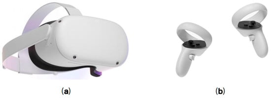 Oculus Quest 2. (a) Head-mounted display. (b) Two controllers for Oculus Quest 2.