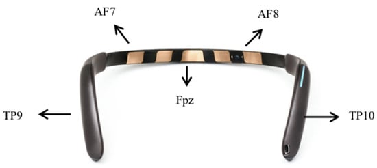 The MUSE 2 EEG headband is a four-channel EEG device, consisting of four dry electrode channels (TP9, AF7, AF8, and TP10) and reference electrodes (Fpz). AF7 and AF8 are the two forehead electrodes, while TP9 and TP10 are two ear electrodes. The electrode positions of the Muse 2 EEG headband are shown in Figure 3. Brain activity data measured by MUSE 2 are transferred to Mind Monitor software (version number 2.3.0) at a sampling rate of 256 HZ via a Bluetooth serial connection stream for offline analysis.