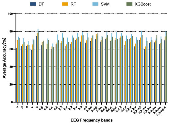 In order to identify the bands that discriminate MCI patients at maximum validity, this study used a band selection algorithm [39] to select the most significant EEG bands that correctly classify MCI to the maximum extent. In the band selection algorithm, a leave-one-out cross-validation scheme was used, where the number of folds was equal to the number of instances in the experiment. The training of the data was formed on all but one instance, and the iterations were repeated 1000 times to calculate the average accuracy of all folds to select optimal EEG bands. Figure 5 shows the average accuracy of performing optimal band selection for the EEG data in this study by using the band selection algorithm. It can be observed that the SVM classifier gave the highest accuracy in the theta band. The results showed that the highest MCI classification accuracy was achieved for all band combinations when applying the features of the theta band. Thereafter, feature selection was performed in the theta band using RFECV. The feature subsets selected for Task 1 including MP (TP9), ShE (AF8), SE (AF7), and DASM (TP9 and TP10). For Task 2 including MP (TP10), ShE (TP9), SE (AF7), DASM (TP9 and TP10), and RASM (AF7 and AF8). For the speech data, Task 1 applied RFECV to generate a subset of features including the sum of effective speech duration, ratio of short pause/speech counts, and total characters. The subset of features selected for Task 2 including jitter, sum of effective speech duration, ratio of short pause/speech counts, and total characters. For the digital cognitive parameters, they both chose the feature of total time spent on the test.