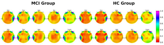 We visualized the power spectral density of EEG data from MCI patients and healthy controls at rest, as well as during the task, as shown in Figure 7. The color bar on the right side of the figure represents the depth of color, where purple represents high brain activation and red represents low brain activation. From the experiments, it can be concluded that: (1) The two groups produced significantly different brain activity in the theta and delta bands. (2) With language stimulation, an increase in power spectral density at different levels was detected in MCI patients and healthy individuals at lower frequency bands compared to the resting state, and a more pronounced increase in power spectral density was detected at lower frequencies in the MCI group compared to healthy individuals. In addition, we found that the theta band had a more pronounced different brain activity visually compared to the delta band.