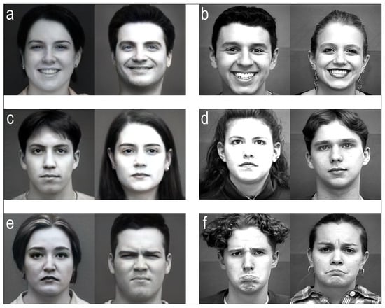 Synthetic faces were generated through a generative-AI algorithm (i.e., FaceMix) [21] by mixing together 4 grayscale real images, all expressing the same type of emotion, randomly sampled each time from the real faces set. Stimuli were presented only once, balanced in sex, type of emotional facial expression (positive, neutral, negative), and type of image, i.e., synthetic or real. The dataset comprised three classes, specifically, the synthetic class, real class, and emotional class, where the latter included both real and synthetic faces split for the 3 different emotional expressions. Volunteers sat on a chair wearing an EEG helmet in front of a monitor where stimuli were presented. The experimental protocol was composed of two phases, as shown in Figure 1. The first phase was a 4 min baseline acquisition with 2 min of closed and 2 min of open eyes. In the second phase, subjects observed 60 images of faces (for a complete overview, please refer to Figure S1 in the Supplementary Materials), composed by 3 sets of 20 faces (10 real and 10 synthetic). Each set contained faces associated exclusively with a polarized mood: positive (happy or smiling faces, Figure 2a,b and Figure S1a), referred to as “happy”; neutral (relaxed faces, neutral expressions, Figure 2c,d and Figure S1b); or negative (sad, angry or discomforted faces, Figure 2e,f and Figure S1c), referred to as “sad”. Both faces and sets were presented randomly for each subject. Each face was observed for 10 seconds by the subject, who was requested to finally press “z” or “m” on a keyboard if the presented stimuli were, respectively, considered synthetic or real. Image presentation and response times were, respectively, managed and recorded through the software interface.