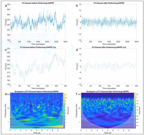 Example of EEG data from P3 channel before (a,c,e) and after (b,d,f) performing HAPPE.