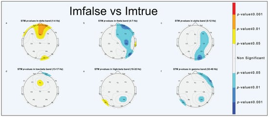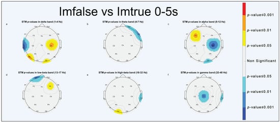STMs of significant statistical activation of brain areas for “Imfalse vs. Imtrue” comparison (0–5 s). (a) delta band, (b) theta band, (c) alpha band, (d) low-beta band, (e) high-beta band, (f) gamma band.