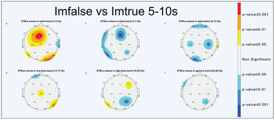 STMs of significant statistical activation of brain areas for “Imfalse vs. Imtrue” comparison (5–10 s). (a) delta band, (b) theta band, (c) alpha band, (d) low-beta band, (e) high-beta band, (f) gamma band.