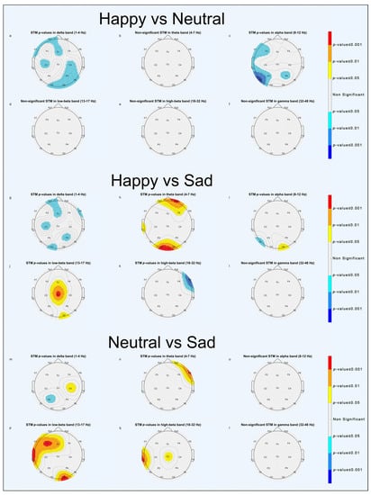 Our findings in the emotional comparison show that it is feasible to discriminate between positive, negative, and neutral emotions. Results of frontal theta activation for happy faces (Figure 7h), especially in the second part of the epoch (Figure S3h), are consistent with findings by Knyazev et al. reporting higher sensitivity to happy faces than to angry ones in the late, conscious FP stage [42]. Moreover, other statistical outcomes are reported in the Supplementary Materials in Figures S2g–l and S3g–l and show how brain activation drastically changes between the first and the latter 5 seconds of the epoch in the “Happy vs. Sad” comparison more than any other.