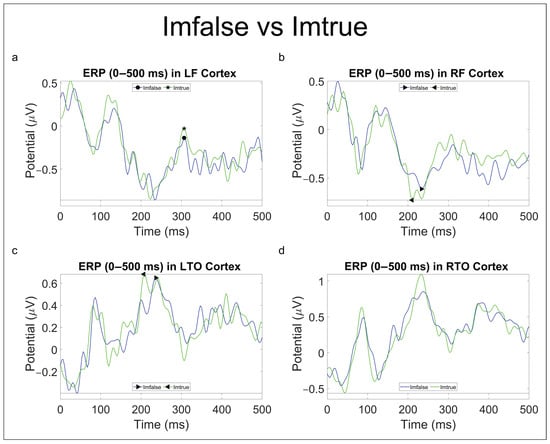 ERP (0–500 ms) in LF (a), RF (b), LTO (c), and RTO (d) areas for “Imfalse vs. Imtrue” comparison. Significant p-values () for peaks amplitude are reported with the ★ (indicating prevalence) and ● symbols, whereas for peaks latency, they are reported with the ◂ (indicating prevalence) and ▸ symbols.