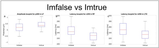 Boxplots of amplitude distributions in LF area (a) for P300 component and latency distributions for N250 component in RF (b) and LTO (c) areas for “Imfalse vs. Imtrue” comparison.