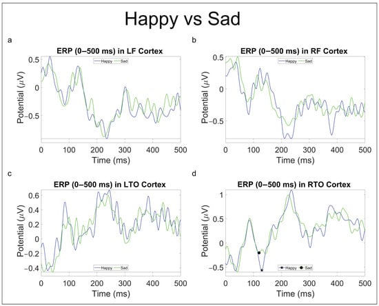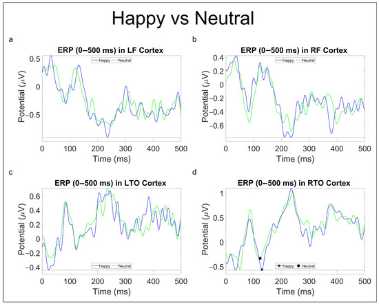 ERP (0–500 ms) in LF (a), RF (b), LTO (c), and RTO (d) areas for “Happy vs. Sad” comparison. Significant p-values () for peak amplitude are reported with the ★ (indicating prevalence) and • symbols.