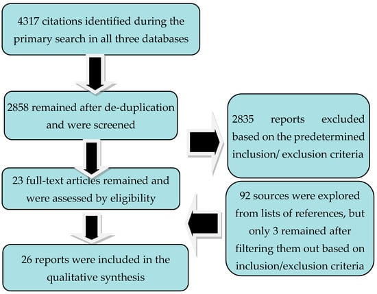 After applying the paradigm search, a total number of 4317 papers surfaced, but only 2858 remained after de-duplication. Succeding the application of the inclusion/exclusion criteria, out of the screened papers, only 23 reached the final phase of the review. Another 92 references were explored after the lists of references were consulted, but only 3 were considered for review after operational criteria were applied (Figure 1).