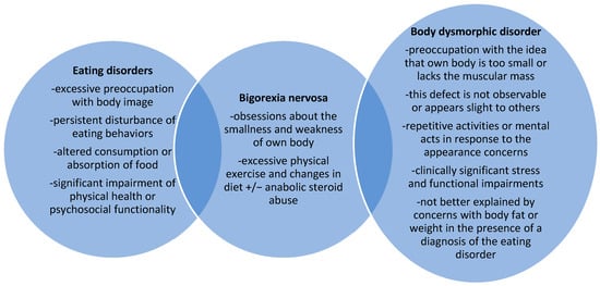 Patients with bigorexia nervosa share clinical features with individuals diagnosed with anorexia nervosa, such as concerns about body weight and shape, appearance intolerance, and functional impairment [,], and disordered eating has been associated with a higher risk of bigorexia [,]. More than 20% of these patients had a history of anorexia nervosa, and almost 30% had a past diagnosis of any FED [,]. However, current nosological classifications support the inclusion of bigorexia nervosa in the category of “BDDs” [,].