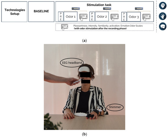 The influence of odors at the brain level has been broadly studied in the scientific literature. Odors have shown the property of increasing memory recall, inducing relaxation, or even enhancing humans’ mental abilities. Aromatherapy is a discipline that has been used for millennia as an alternative medicine in different cultures, resulting in effective treatment of some disorders such as insomnia [1], anxiety [2], and depression [3]. In addition to these clinical applications, the effects of fragrances on the human mind and behavior is also of great interest for all those applications related to everyday life, such as cosmetics, personal care, nutrition, comfort, and psychophysical well-being [4,5]. The power of scents has always fascinated scientists, who tried to demonstrate their impact at the human psychophysiological level using the most advanced technologies for biosignal and neuroimaging analyses. Several studies conducted in the field of the functional magnetic resonance imaging (fMRI) have found that brain regions primarily involved in emotions, such as the amygdala, hypothalamus, and prefrontal cortex are activated during odor stimulation [6]. Regions generally allocated for memory and recognition such as the lateral and medial temporal cortex have also been implicated in these processes [7]. Some researchers have also pointed out a lateralization of the olfactory processes, as reported by Royet and Plailly in their review [8], in which the left hemisphere is described as related to emotions, while the right hemisphere is linked to memory. A broad range of literature has also investigated the effect of scents at the brain level using electroencephalograms (EEGs) [9]. Since its portability allows a natural fruition of odors, the methodology is particularly suitable for this application, with less invasiveness and in more realistic contexts.