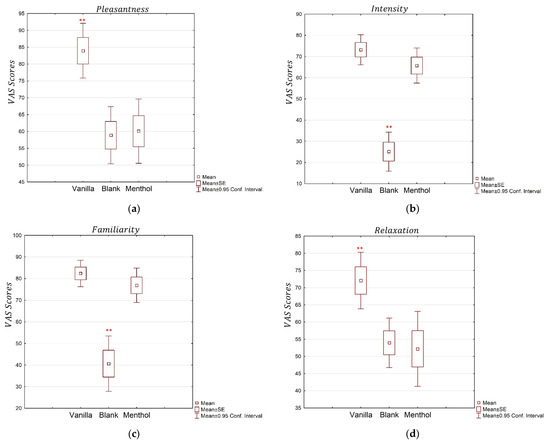 The average VAS scores for the four explored dimensions: pleasantness (a), intensity (b), familiarity (c), and relaxation, and (d) for the three odor conditions: vanilla, blank, and menthol. “**” indicates when the VAS values are significantly different from the others, with p < 0.01.