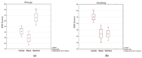 The average EOS scores for the two considered emotions, the energy (a) and soothing (b) dimensions, for the three odor conditions: vanilla, menthol, and blank. “**” indicates when the VAS values are significantly different from the others, with p < 0.01.