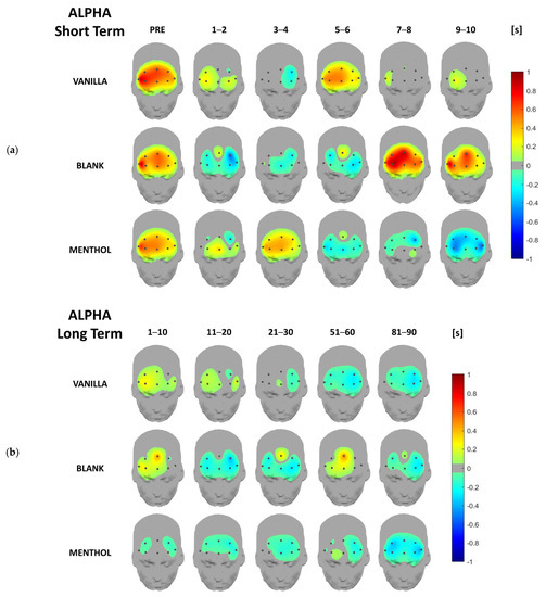 Additionally, the alpha power was modulated by the kind of odor. On a short-term scale, the headplots show a remarkable power increasing for the blank condition which occurs at 7–8 s from the odor exposition, even achieving similar pre-stimulus levels after initially decreasing in the first seconds (Figure 5a). The vanilla showed a similar effect, i.e., an initial decrease followed by an increase in new alpha power, but over a shorter time (between 5 and 6 s). On the contrary, the menthol appeared to generate a power decrease within the first four seconds after the odor exposition.