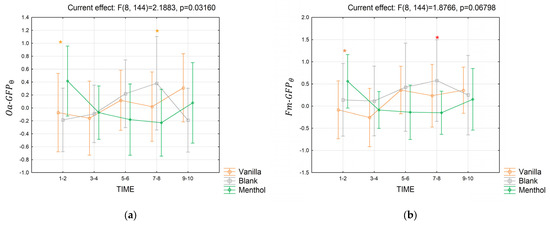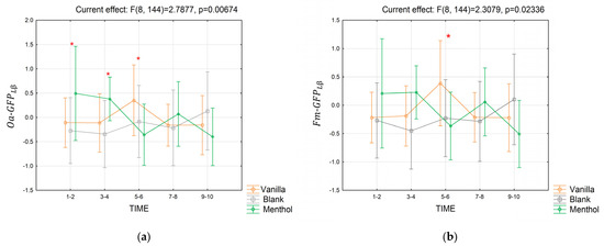 Concerning the low beta band, significant interactions for both (Figure 11a) and (Figure 11b) were found in the short-term response (partial η2 = 0.13, p = 0.0067 and partial η2 = 0.11, p = 0.02). The Duncan analysis revealed that in seconds 1–2, assumed higher values during the menthol stimulation compared to the vanilla and blank (p = 0.07 and p = 0.027), while in seconds 3–4, it was higher for the menthol compared to the blank (p = 0.038). In seconds 5–6, it was higher for the vanilla compared to the menthol (p = 0.04). assumed higher values in seconds 5–6 during the vanilla stimulation compared to the blank (p = 0.09) and menthol (p = 0.04). No effect was found for the long-term response.