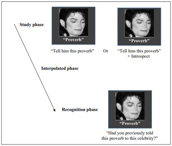 Destination memory assessment and response recording were conducted using the software package Psychopy [42] coupled with a laptop computer and a 17-inch LCD display. The procedures, depicted in Figure 1, consisted of a study phase, an interpolated phase (to avoid relying on immediate memory), and a recognition phase. Participants were informed in advance that their memory of the association between proverbs and faces would be subsequently tested. The study phase consisted of 24 trials, each beginning with a one-sec white fixation cross followed by a proverb (e.g., “Fortune favors the bold”) presented in white Times New Roman 40-point font below a (12 × 12 cm) celebrity’s face (e.g., Elvis Presley). During each trial, participants were tasked with sharing a proverb with a celebrity, and there was no imposed time limit for this interaction. It is worth noting that the proverbs used in this study adhered to the formal French language, and those featuring archaic or vernacular language were intentionally excluded. The celebrities chosen for this task encompassed a range of well-known figures, including French and international musicians, artists, politicians, entertainers, athletes, and other prominent individuals who were notable and frequently featured in the news. It is important to mention that in previous research conducted with French populations, careful attention was paid to controlling and standardizing the level of familiarity associated with both the proverbs and the selected celebrities [43].