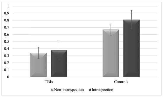 We compared scores on destination memory between patients with TBI and controls across the two experimental conditions (non-introspection vs. introspection); performances are depicted in Figure 2. Because of abnormal distributions, demonstrated using the Kolmogorov–Smirnov test, non-parametric tests were used. Results were provided with the observed power as follows: d = 0.2 is considered a small effect size, d = 0.5 represents a medium effect size, and d = 0.8 refers to a large effect size [44]; d was calculated for non-parametric tests following recommendations by Rosenthal and DiMatteo [45], and Ellis [46]. For all tests, the level of significance was set as p ≤ 0.05. To provide further insight into the introspection effect, group comparisons were followed by an analysis of individual profiles.