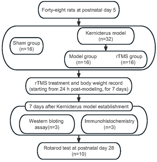On postnatal day 5, the rat pups (weighing 9–12 g) were randomly allocated into three groups: the sham group (n = 16), the model group (bilirubin with sham rTMS; n = 16) and the rTMS group (bilirubin with rTMS, n = 16). The pups were anesthetized with diethyl ether before the model establishment. The rats in the model group and the rTMS group each received an intracisternal injection of a 10 μg/g (body weight) bilirubin solution into the cisterna magna using a microinjector. The sham group was injected with equal volumes of ddH2O (pH = 8.5). Before the bilirubin or ddH2O was applied, an equal volume of the cerebrospinal fluid specimen was drained to prevent intracranial hypertension [23]. The complete experimental process is shown in Figure 1.