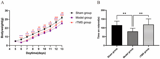 On the first day after modeling, the body weights of the model group and the rTMS group significantly decreased compared to the sham group (p < 0.001). Subsequently, although the body weights of the rats in the model group and the rTMS group gradually increased, they remained lower than those in the sham group (p < 0.001). The rTMS group, which underwent rTMS intervention, exhibited significant increases in body weight and faster recovery (p < 0.05) (Figure 2A). In the present experiment, the injection of UCB through the cisterna magna had a detrimental effect on the general health of the rats while the rTMS mitigated the damage caused by the UCB and promoted their recovery.