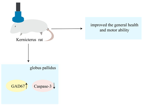 To our knowledge, this study is the first to have confirmed the protective effects of rTMS on pallidal GABAergic neurons in rats with kernicterus: improved general health and motor ability. The findings of this study revealed that the rTMS increased the protein expression levels of GAD67 while simultaneously inhibiting caspase-3 activation. The mechanism described in this study is shown in diagram form in Figure 5. In summary, rTMS could be a promising treatment for kernicterus, with the potential to inhibit apoptosis and exhibit protective effects on GABAergic neurons in the globus pallidus, thereby alleviating UCB-induced motor dysfunction.