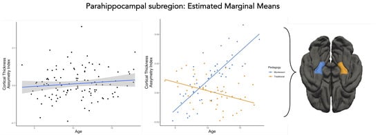 Based on past work revealing similar executive abilities among wealthy Swiss schoolchildren enrolled in either Montessori or traditional schools [], we do not expect CTh AI differences within the prefrontal brain regions when comparing these groups of students. However, regarding the PHC region, we suspect that the opposed memorizing strategies found in Montessori versus traditional practices would reinforce the lateralization of one versus the other hemispheres. In fact, Montessori-schooled students excel in recognition tasks compared with traditionally schooled students []. Denervaud et al. (2019) further show that semantic networks are highly permeable to educational experience. They find that compared with students experiencing a traditional education, students experiencing Montessori education show a more flexible semantic network structure, characterized by higher connectivity and shorter paths between concepts, as well as lower modularity. Also, working memory is modulated in favor of Montessori-schooled students [,,]. Finally, neural asymmetry has already been shown in functional connectivity in relation to pedagogy and memory: for correct answers, the traditional pedagogy group shows stronger connectivity between brain regions related to error monitoring (e.g., the anterior cingulate cortex and the right hippocampus []). Therefore, an asymmetry in cortical thickness of memory-related regions as a function of school experience may arise.