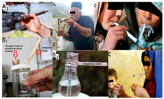 Different types of tools used for smoking opium in Iran: (A1) Vafour, (A2) opium smoking with a Vafour; (B1) a type of Gholgholi, (B2) another type of Gholgholi; (C) Sikh-o-Sang.