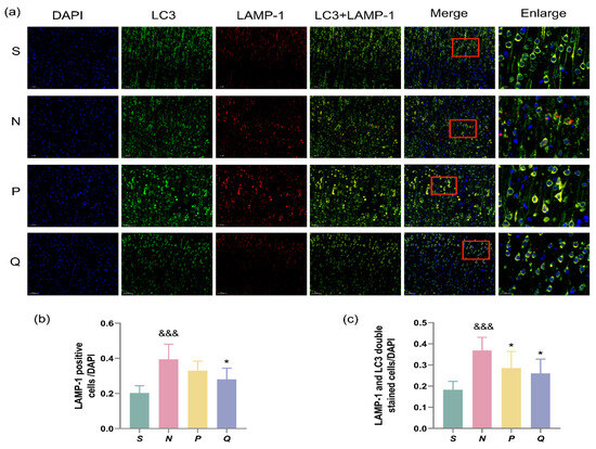 The results demonstrated a significantly higher ratio of LAMP-1 positive cells/DAPI in the N group compared to the S group (p < 0.001), whereas the ratio in the Q group was significantly decreased compared to the N group (p < 0.05) (Figure 6a,b). Additionally, a significantly higher ratio of double-stained LC3 + LAMP-1 cells/DAPI was observed in the N group versus the S group (p < 0.001). Conversely, the ratio of double-stained LC3 + LAMP-1 cells/DAPI was significantly lower in the P and Q groups than in the N group (p < 0.05) (Figure 6a,c). Our results indicate that after CIRI, the expression level of lysosomes in the cerebral cortex of rats increases, along with a significant increase in the formation of autophagic lysosomes. Moreover, increasing serum (K+) levels reduce the generation of both lysosomes and autophagic lysosomes.