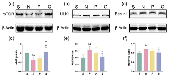 WB analysis of mTOR, ULK1, and Beclin1. (a–c) WB band of mTOR, ULK1, and Beclin1; (d–f) WB analysis of mTOR, ULK1, and Beclin1. n = 5. All data above are represented as the mean ± SD. && p < 0.01 and & p < 0.05 vs. the S group; ** p < 0.01 and * p < 0.05 vs. the N group; ## p < 0.01 vs. the P group; S: sham, normal saline; N: normal saline + CA/CPR; P: moderate hyperkalemia P + CA/CPR; Q: moderate hyperkalemia Q + CA/CPR.