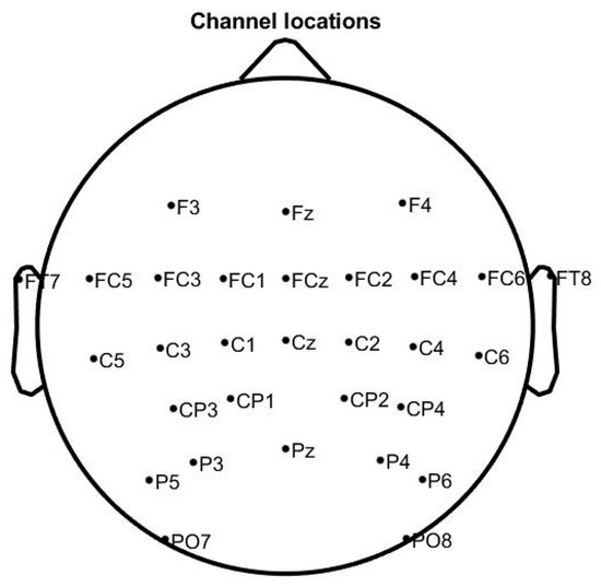 Twenty-eight healthy subjects (mean age: 22.4 ± 3.7 years, male/female: 17/11) who reported no history of neurological diseases or psychiatric disorders were recruited to participate in the experiment. All subjects were right-handed with normal or correct-to-normal vision, and gave written informed consent. EEG signals were recorded using a Neuracle wireless amplifier from international 10–10 EEG caps with 64 electrodes located over the scalp region. The reference electrode was CPz, and the ground electrode was AFz. We selected 30 electrodes (F3, Fz, F4, FT7, FC5, FC3, FC1, FCz, FC2, FC4, FC6, FT8, C5, C3, C1, Cz, C2, C4, C6, CP3, CP1, CP2, CP4, P5, P3, Pz, P4, P6, PO7, PO8) for analysis, and the position of these electrodes is shown in Figure 1. We prevented the position of EEG electrodes varying between the sessions by measuring the center point of the head in both horizontal and vertical directions with the brain cap electrode when wearing the EEG cap.