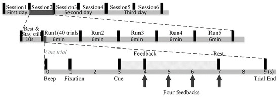 As shown in Figure 2, our MI experiments were conducted for three consecutive days. Each day comprised two sessions, leading to a total of six sessions and five runs, each of approximately a six-minute duration, making up one session. In each session, subjects were asked to rest and stay still for 10 s before the first run. Subjects could rest as long as they wished in the interval between the two runs. Each run is composed of 40 trials. At the trial start, a short 0.5 s beep sound with the frequency of 500 Hz prompted subjects to shift their attention to the screen. Then, the fixation appeared to remind subjects to rest and stay still. After two seconds, subjects performed motor imagery of the left hand when the left arrow appeared, or the right hand when the right arrow appeared. Note that we told subjects to keep their hands still while performing imaginary movements. The motor imagery task lasted four seconds. Afterwards, a 2 s rest period was offered, and the next trial followed. Furthermore, subjects were told they should suppress muscle movement to avoid artifacts. This paper used 1 s resting-state data before the left and right motor imagery tasks of all trials in dataset 3. All the experimental procedures were approved by the Northwestern Polytechnical University Medical and Experimental Animal Ethics Committee.