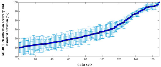 The MI-BCI classification accuracy and standard deviation calculated from 168 sets of MI experimental data are shown in Figure 4. The average classification accuracy was 70.21 ± 5.72%, and it is clear that the classification accuracy covered the full range from chance-level performance (50%) to complete control (100%). When the classification accuracy was higher than 75%, this set of data was considered to have better MI-BCI performance, referred to as the “high group”, and the remaining data belonged to “low group”.