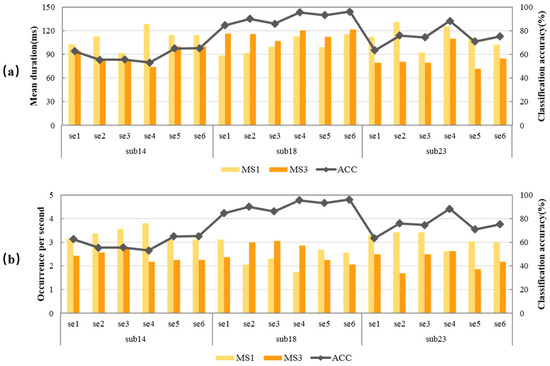 Relationship between classification accuracy and MS1, MS3 of the three representative subjects. (a) MS1 mean duration and MS3 mean duration; (b) MS1 occurrence per second and MS3 occurrence per second.