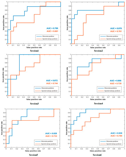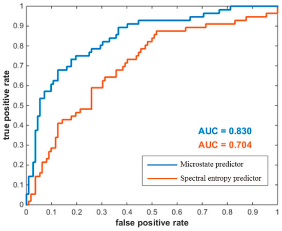 A receiver operating characteristic (ROC) analysis was first conducted to evaluate the classification capability of the proposed microstate predictor for all data, where the “high group” and the “low group” were defined as positives and negatives, respectively. As shown in Figure 6, microstate predictor’s prediction performance was compared with spectral entropy predictor. The resulting area under curve (AUC) was 0.830 for the microstate predictor, and 0.704 for the spectral entropy predictor.