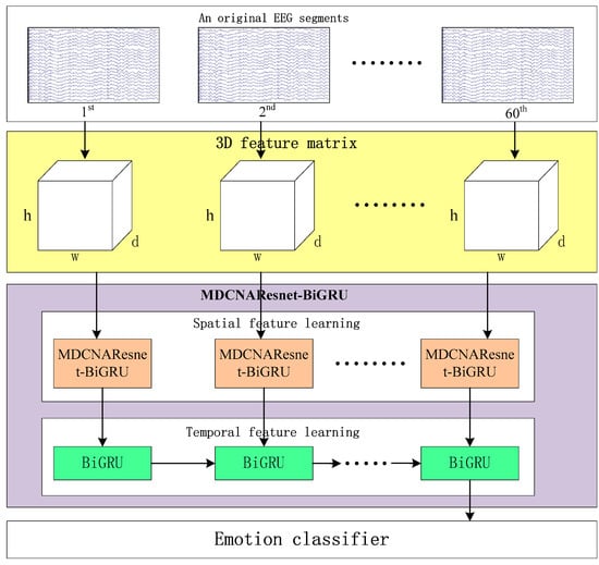 Figure 1 illustrates the framework of MDCNAResnet-BiGRU for emotion recognition based on EEG signals. It consists of three parts: constructing the three-dimensional feature matrix, the MDCNAResnet-BiGRU network model, and the classifier. In the following section, we provide a detailed explanation of each part in the following order.
