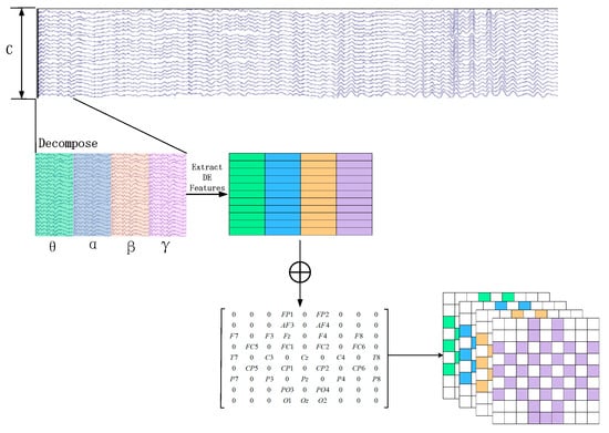 Assuming an original EEG signal is represented as , where and represent the number of electrodes and the sampling rate of the original EEG signal, respectively. For each group of EEG sample signals, we calculate the DE feature for each frequency band using a sliding window of 1 s. Therefore, the EEG segment is transformed into DE segments , where represents the number of frequency bands, which is set to 4 in this paper, as depicted in Figure 2.