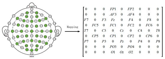 Later, in order to utilize the spatial information of electrodes, we transform all EEG channels into a 2D grid map. In this study, we used 32-channel EEG data, with each of the 32 channels representing Fp1, AF3, F3, F7, FC5, FC1, C3, T7, CP5, CP1, P3, P7, PO3, O1, Oz, Pz, Fp2, AF4, Fz, F4, F8, FC6, FC2, Cz, C4, T8, CP6, CP2, P4, P8, PO4, and O2. Figure 3 displays the standardized flat map of the international 10/20 system and its corresponding 2D matrix. The left side of the figure represents the international 10/20 system, where solid circles indicate the EEG electrodes used in the DEAP dataset, and hollow circles represent the unused test points. In the feature matrix, the frequency domain features extracted from different EEG channels are placed in the corresponding positions of the matrix based on their relative spatial coordinates. The positions in the matrix that correspond to unused electrodes are set to 0. Therefore, the DE segment is transformed into , where and represent the height and width of the 2D matrix, respectively. In this study, we set = 9 and = 9. Finally, the constructed 3D feature matrix is input into the neural network model.