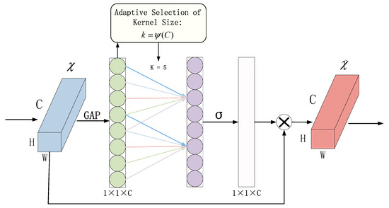 In this paper, ECANet is introduced into the network model. The principle of ECANet is shown in Figure 4. Without reducing the dimensionality, the input feature map χ undergoes global average pooling across all channels. ECA learns through a one-dimensional convolution with weight sharing and considers each channel’s interaction with its k neighbors to capture inter-channel interactions. In ECANet, the matrix is used to learn channel attention, as shown in Equation (3).