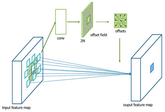 A Deformable Convolutional Network (DCN) is a convolutional operation proposed by Dai et al. [34] in 2017. It introduces additional offset variables at each sampling point, which allows the convolutional kernel to effectively sample the data without being restricted to a fixed shape. This significantly increases the receptive field of the convolutional operation and enhances the modeling capability of convolutional neural networks for irregular objects. The operation of a DCN is illustrated in Figure 6. Initially, a DCN performs convolutional operations on the input feature map to obtain a set of predicted offset maps. The size of the offset feature map remains the same as the input feature map. The channel dimension of the offset feature map is 2N, where 2 represents the two values (x, y) for each offset and N is the number of pixels in the convolutional kernel.