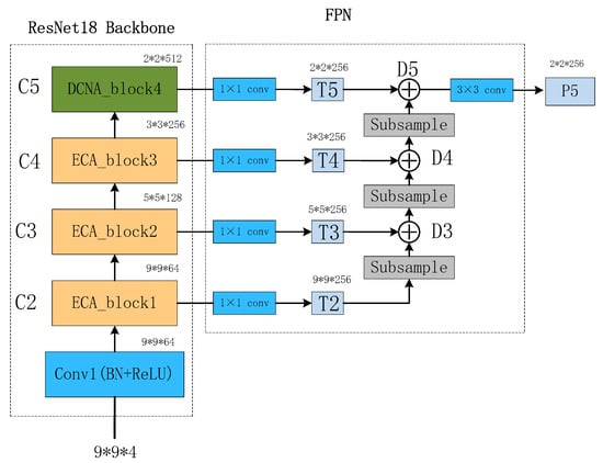 The structure of the BU-FPN is illustrated in Figure 9. Taking ResNet18 as the backbone, C2 to C5 feature maps are obtained through convolutional operations. Then, a 1 × 1 convolutional layer is applied to maintain the consistency of feature map dimensions, resulting in T2 to T5 feature maps. The downsampling process starts from T2 and continues as follows: