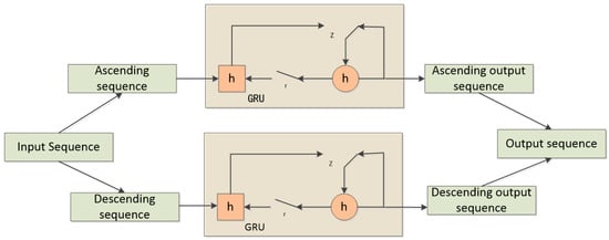 A BiGRU (Bidirectional Gated Recurrent Unit) consists of two regular GRU units that process two different directions of the time sequence (forward and backward). The outputs of the two sequences are then concatenated. In this way, BiGRU is able to capture both past and future context information. In the context of emotion recognition, individuals often generate corresponding feedback in the brain based on the intensity of the stimulus they receive. Therefore, in this study, BiGRU is employed to extract contextual semantic information from both forward and backward sequences. The principle of BiGRU is illustrated in Figure 10.