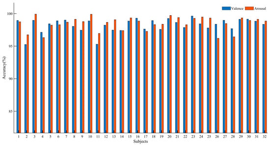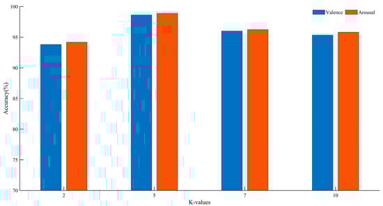 In k-fold cross-validation, different values of k can impact the final classification accuracy. By varying the size of k, performance comparisons were conducted on the DEAP dataset. The experimental results are shown in Figure 12.