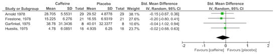 A meta-analysis was performed to compare general ADHD symptoms (four studies; n = 76) [52,54,57,59]. There was no significant difference between caffeine and placebo in the incidence of overall ADHD symptoms (SMD: −0.12; 95% CI: −0.44 to 0.20; p = 0.45; I2 = 0%) (Figure 2).