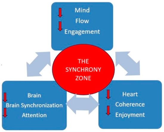 EEG technology allows us to measure brain processes during learning and can measure attention and engagement over 16 hours. [85,92,109,110,111,112,113,114,115,116]. The level of synchrony reflects the level of attentional engagement [31,93]. By contrast, lack of engagement was reflected in a lack of synchrony [86].