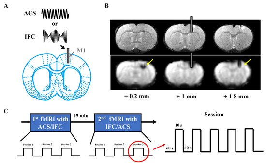 Experimental protocol for conducting concurrent stimuli fMRI experiment. (A) A homemade electrode was implanted into the M1 area of the rat brain, through which a stimulus was directly exerted on the cortical neurons. The stimulus was composed of either a 10 Hz sinusoidal current wave (as for ACS) or an IFC wave with a base frequency of 2 kHz and a modulated frequency of 10 Hz (IFC). (B) Representative T2-weighted anatomical and EPI images presenting brain slices from posterior 0.2 mm to anterior 1.8 mm. The rectangle in gray color represents the embedded stimulation electrode. The yellow arrow points to an artifact induced by the presence of the electrode. (C) Diagram showing the timing of the BOLD data acquisition: In each session, a stimulus was applied as a block design with a total duration of 6 min and 50 s. All the animals underwent both stimulation protocols with a random order.
