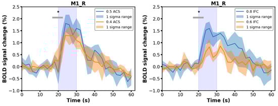 Time course of the BOLD variation in the target area (M1), averaged across a subset of subjects (n = 4) where the activation signal in the region encompassing the electrode could be identified based on the GLM analysis. The time course was averaged across stimulation sessions, and the signal during the stimulus period was shown to be significant to the baseline when the stimulus intensity surpassed 0.4 mA using ACS or 0.6 mA using IFC stimulation (Purple color: stimulus on period; * paired t-test, ).