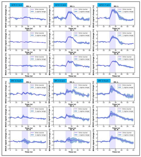 The analogous tendency was confirmed during IFC stimulation sessions, where the intensity of the evoked positive BOLD response increased monotonically with the current intensity gradient. The BOLD profile was comparable with the ACS modality; however, the requisite stimulus intensity to elicit a prominent BOLD response differentiated between the two modalities. Moreover, the overall magnitude of BOLD responses to IFC stimulation was smaller even when a relatively strong electric current was applied.